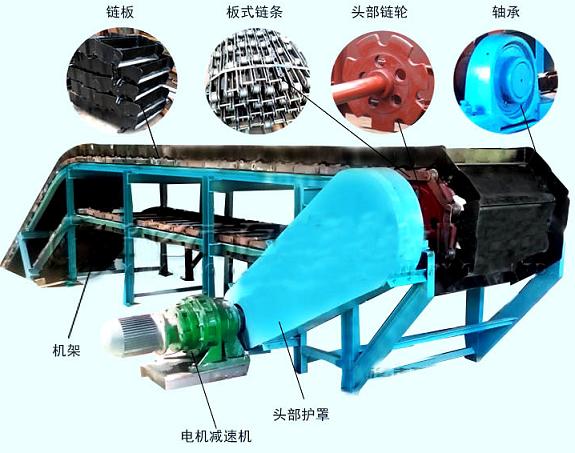 鱗板輸送機(鱗板機)是以閉合的、循環運行的鏈條為牽引構件,用對接的或搭接的平形板、波浪板以及槽型或箱型等構件作為承載構件的輸送設備。牽引構件與承載構件組成鏈板組合裝置;牽引鏈條可以通過鏈條附件與承載構件相連,也可以與承載構件直接相連。承載構件自身承載,并通過滾輪或固定在支架上的托輥來支承。